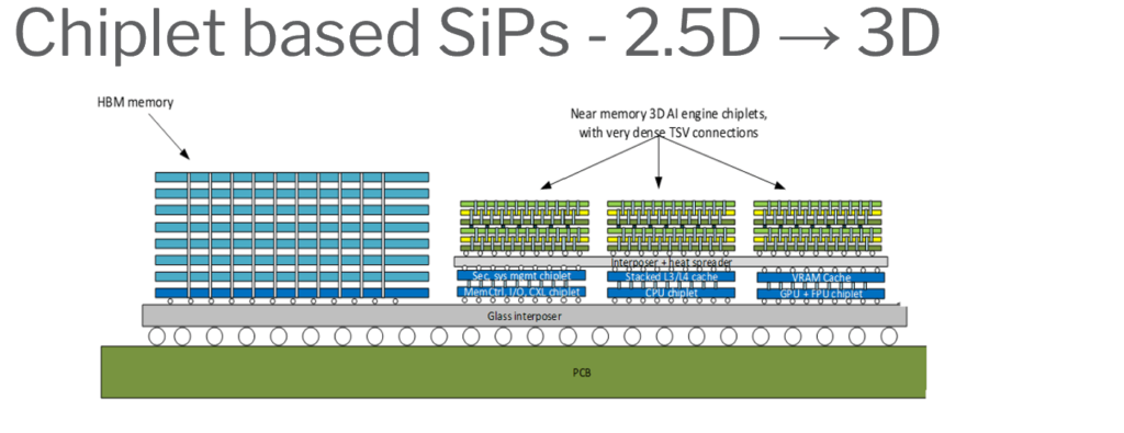 The upcoming generation of chiplet-based systems will feature a mix of 3D integrated devices and 2.5D chiplets. One potential shift could be a transition from silicon-based interposers to glass-based ones, although silicon-based interposers may still be in use.